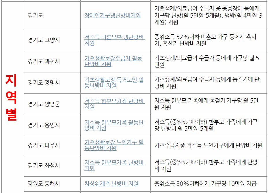 정부에서 취약계층(기초생활수급자, 저소득가수, 차상위계층, 장애인 등)에게 지원하는 가종 가스 난방비, 전기난방비를 지원합니다. 정부 24-보조금 24에서 자세히 확인할 수 있습니다.