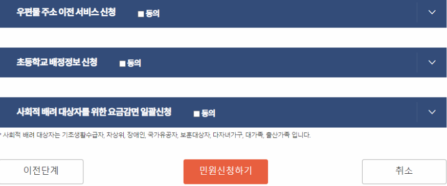 전기요금, 텔레비전 수신료, 도시가스요금 감면신청과 우편물 주소 이전 서비스 신청, 초등학교 배정정보 신청 방법.